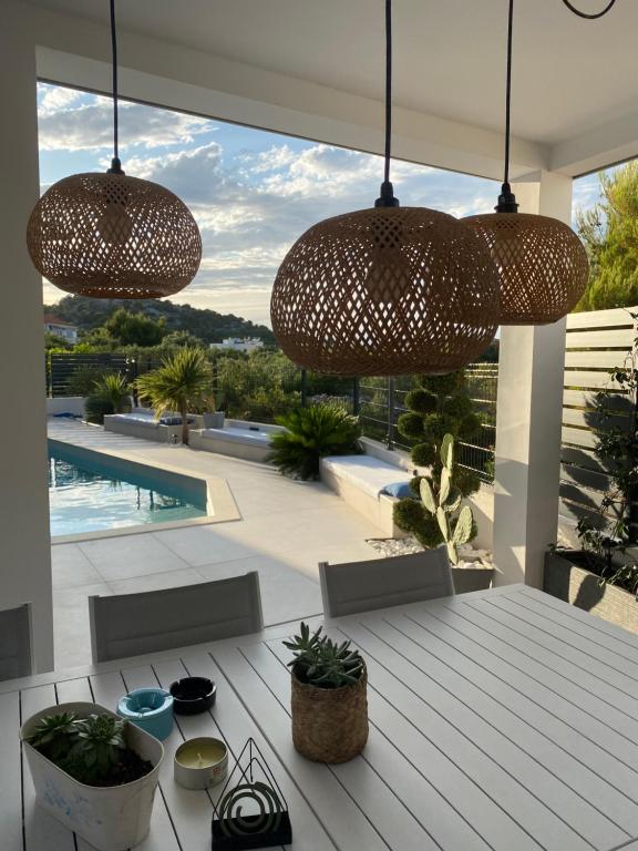 Vila Burin nudi smještaj u Murteru s besplatnim WiFi-jem i pogledom na grad, kao i sezonskim vanjskim bazenom, vrtom i terasom.